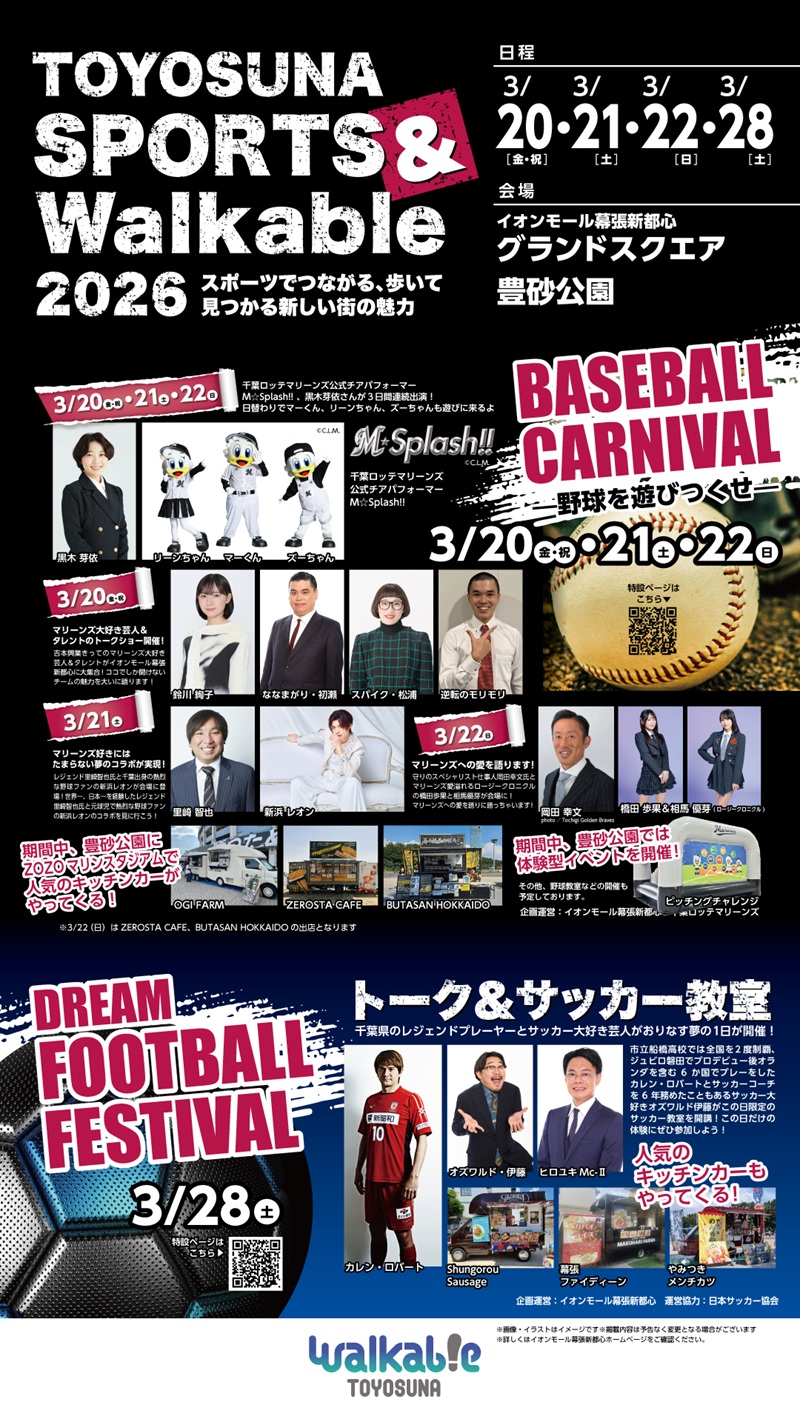| ◇内容: | 幕張豊砂駅 開業3周年記念イベント「TOYOSUNA SPORTS&Walkable 2026~スポーツでつながる歩いて見つかる新しい街の魅力~」がイオンモール幕張新都心で4日間開催。その中で22日に予定されている“マリーンズへの愛を語るトークショー”にゲストとして出演します。 ※トークショーの時間など、TOYOSUNA SPORTS&Walkable 2026の詳細は、イオンモール幕張新都心HPでご確認ください。 |