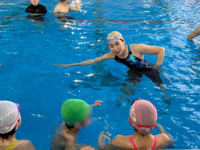 当日は、小中学生を対象とした「こども特別レッスン」(13:30~14:30)と、高校生以上を対象とした「大人特別レッスン」(14:45~15:45)の2部構成で実施。参加者のレベルに合わせながら、水泳の基礎や上達のポイントについて指導を行ないました。